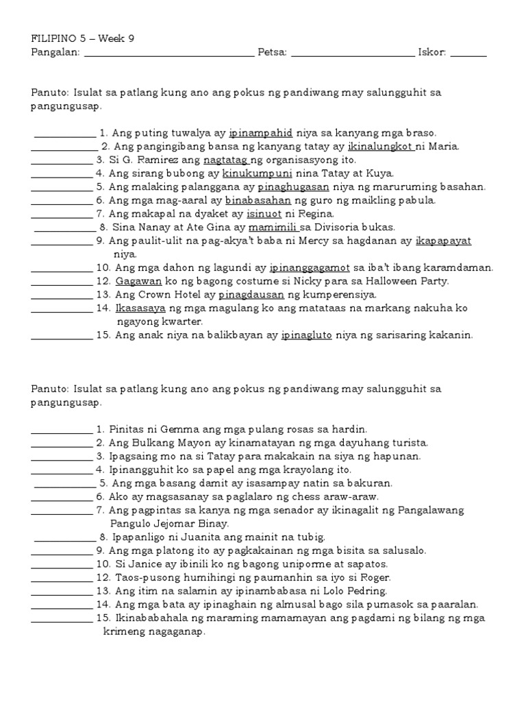 Panuto: Isulat sa patlang kung ano ang pokus ng pandiwang may salungguhit sa
