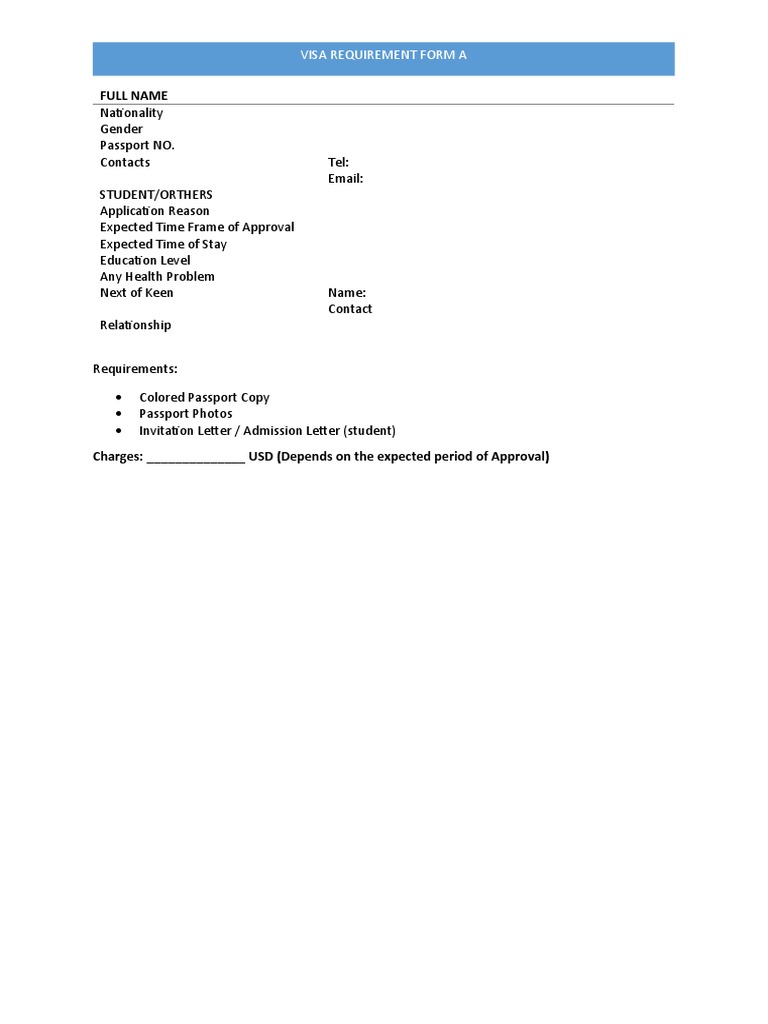 VISA REQUIREMENT FORM A