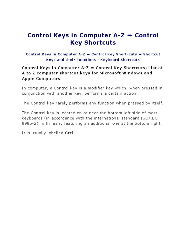 Control Keys in Computer A-Z ➨ Control Key Short-cuts ➨ Shortcut
