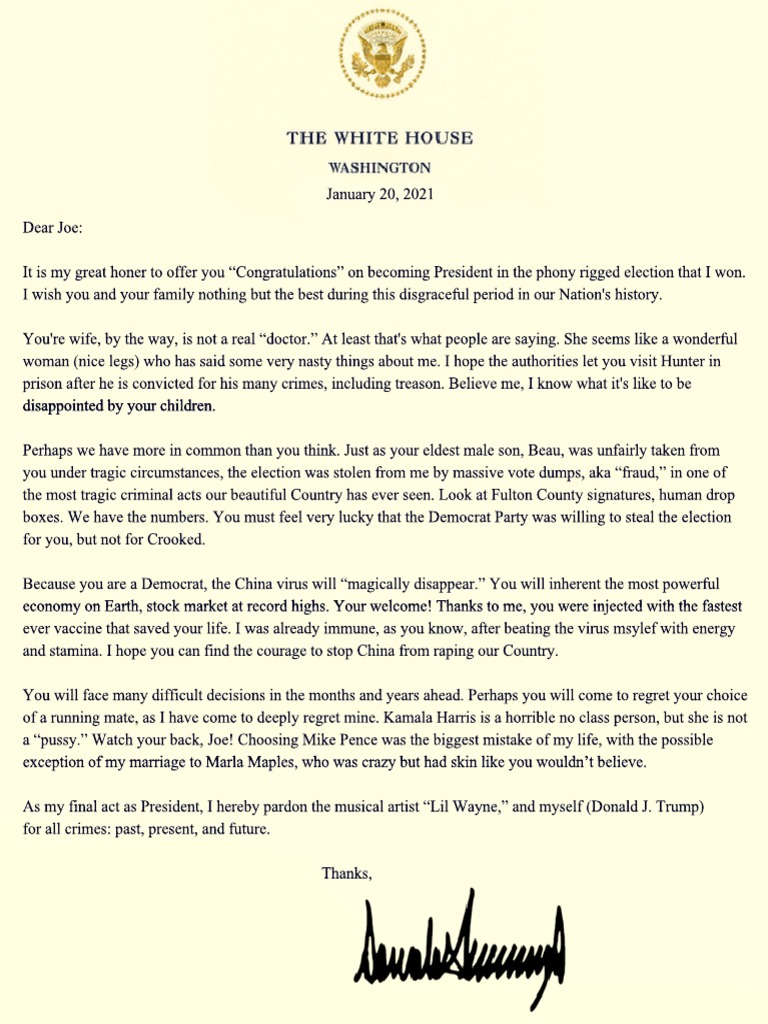 Donald Trump Draft Letter To Joe Biden 1/20/21