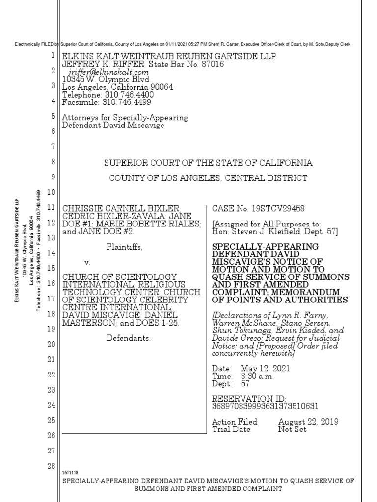 § 418.10 on the ground that Mr. Miscavige was never served with the summons and operative complaint. The Motion is made upon this Notice, the attached memorandum of points and authorities, the Declarations of Lynn R. Farny, Warren McShane, Stano Sersen, Shun Tokunaga, Ervin Kisded, and Davide Greco, the Request for Judicial Notice, all pleadings and documents on file in this action, such further papers and authorities as may be filed in support hereof, and oral argument as may be presented at the hearing on the Motion. DATED: January 11, 2021 ELKINS KALT WEINTRAUB REUBEN GARTSIDE LLP By: JEFFREY K. RIFFER Attorneys for Specially-Appearing Defendant David Miscavige