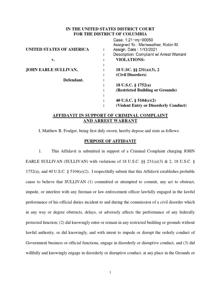 IN THE UNITED STATES DISTRICT COURT FOR THE DISTRICT OF COLUMBIA UNITED STATES OF AMERICA : Case No: : v. : VIOLATIONS: : JOHN EARLE SULLIVAN, : 18 U.SC. §§ 231(a)(3), 2 : (Civil Disorders) Defendant. : : 18 U.S.C. § 1752(a) : (Restricted Building or Grounds) : : 40 U.S.C. § 5104(e)(2) : (Violent Entry or Disorderly Conduct) AFFIDAVIT IN SUPPORT OF CRIMINAL COMPLAINT AND ARREST WARRANT