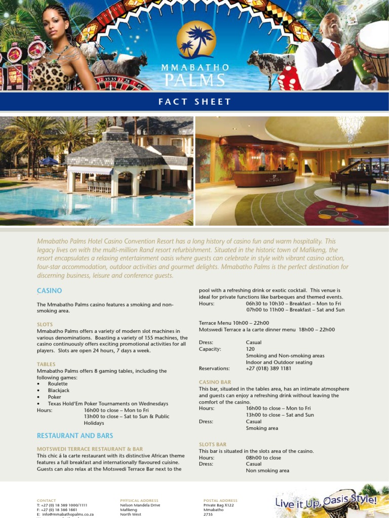 The Mmabatho Palms casino features a smoking and non- Hours: 06h30 to 10h30 – Breakfast – Mon to Fri