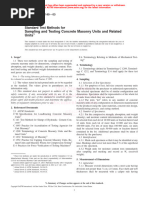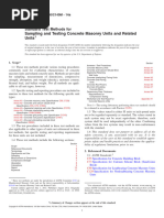 The ASTM C140/C140M standard outlines various testing methods to evaluate concrete masonry units and related units. It includes procedures for sampling, dimension measurement, compressive strength, absorption, unit weight, moisture content, flexural load, and ballast weight. The standard is divided into sections applicable to all units and annexes for specific unit types, such as concrete masonry units, concrete bricks, segmental retaining wall units, interlocking paving units, grid paving units, roof pavers, and dry-cast articulating concrete blocks .