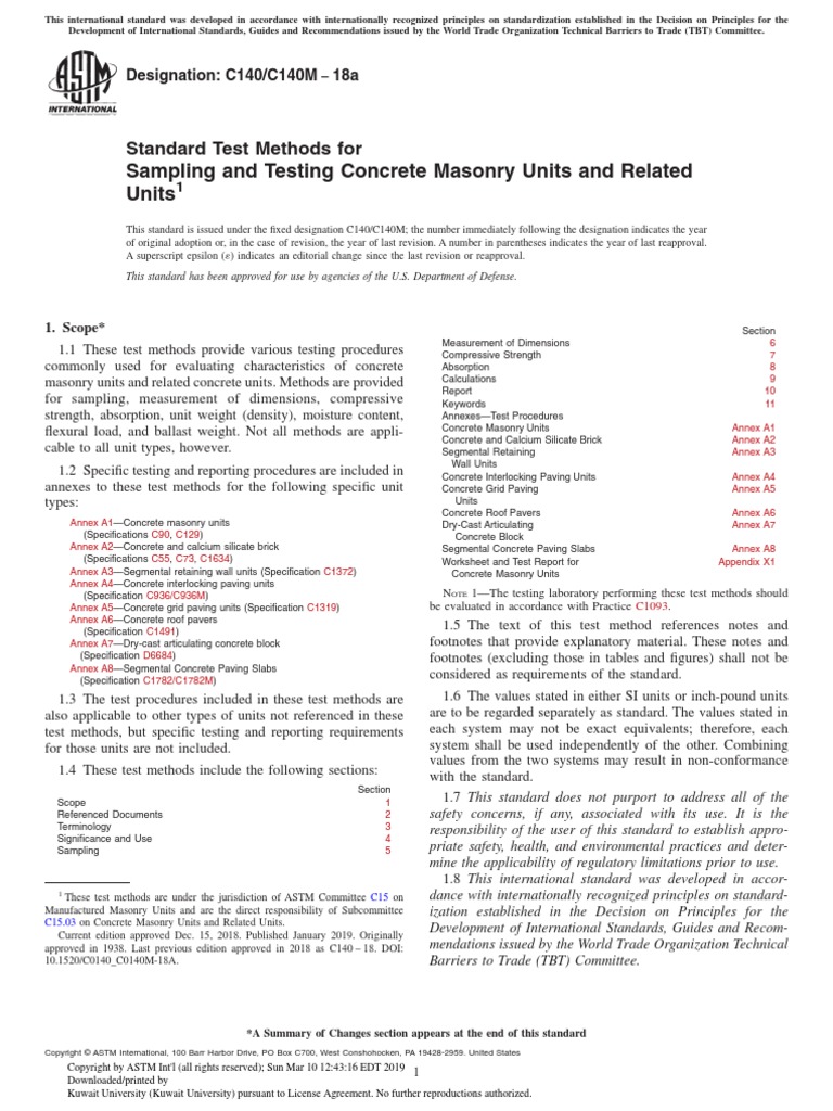 approved in 1938. Last previous edition approved in 2018 as C140 – 18. DOI: mendations issued by the World Trade Organization Technical