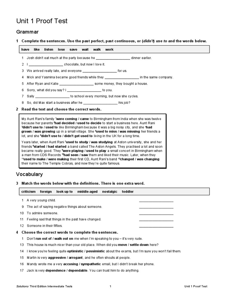 Solutions Third Edition Intermediate Tests 1 Unit 1 Proof Test
