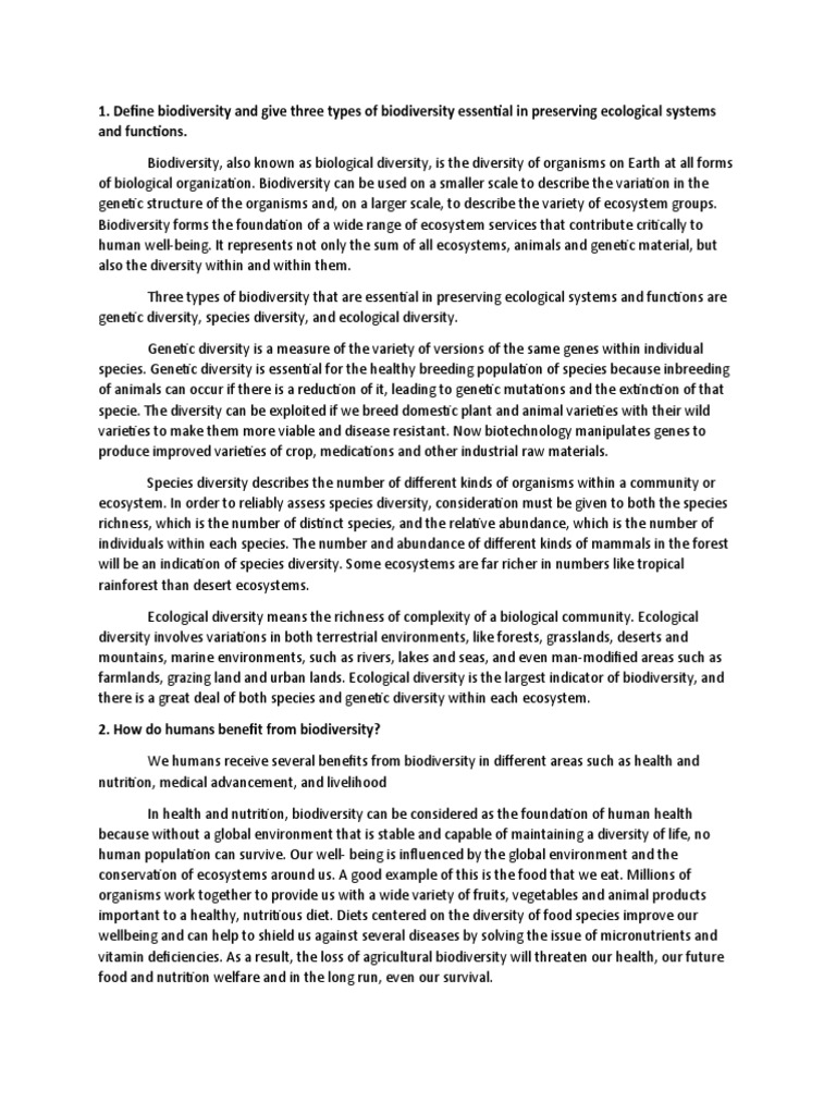 Define biodiversity and give three types of biodiversity essential in preserving ecological systems