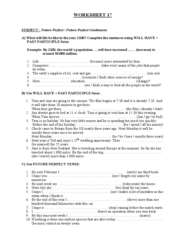 SUBJECT : Future Perfect / Future Perfect Continuous
