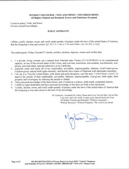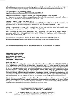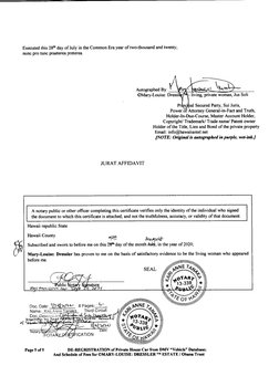 Certification of Sale, Ownership: Outlines the certification of vehicle sale, ownership, and exportation with legal stipulations. Legal References and Statements: Provides detailed references to Hawaiian and Federal statutes regarding vehicle registration and ownership. Notice to Principal and Agents: Contains a formal notice to government entities and agents about the legal status of vehicle registration and ownership. Jurat Affidavit: The formal jurat affidavit where signatories affirm and swear the information is truthful under penalty of law. Notarization and Signature: Concludes the document with a notary verification and signatures of involved parties. ©MARY-LOUISE: DRESSLER™ Estate / Ohana Trust