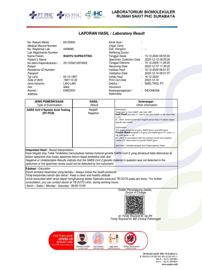 Nama Pasien : WAHYU SUPRAYITNO Tanggal Swab : 15-12-2020 [Link]