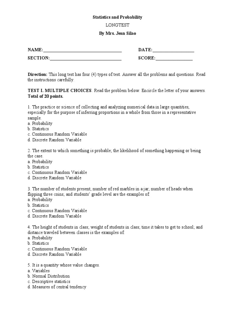 Direction: This long test has four (4) types of test. Answer all the problems and questions. Read