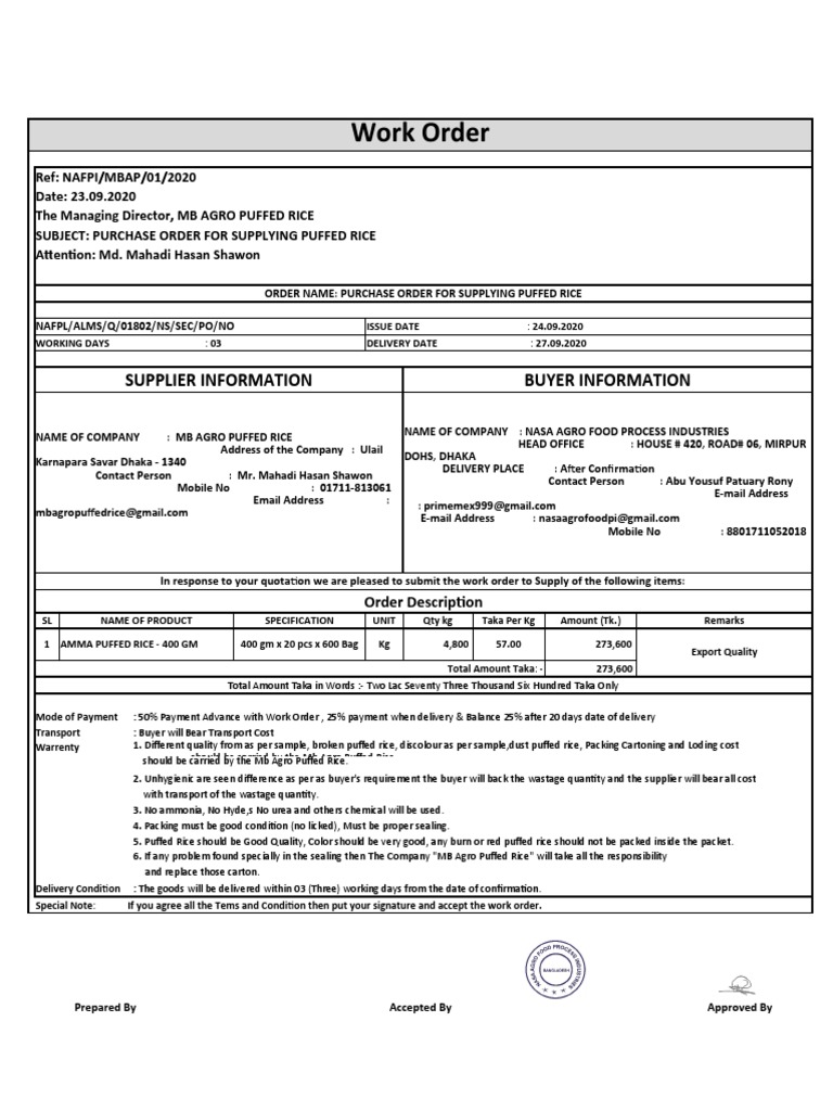 ORDER NAME: PURCHASE ORDER FOR SUPPLYING PUFFED RICE