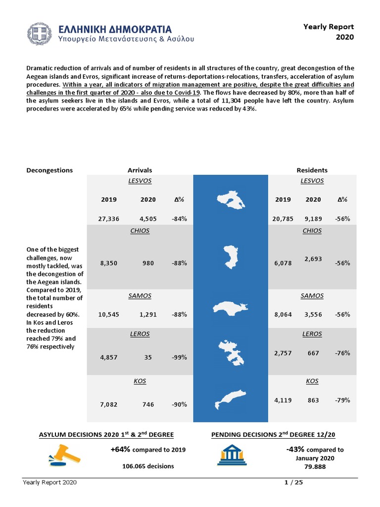 Dramatic reduction of arrivals and of number of residents in all structures of the country, great decongestion of the Aegean islands and Evros, significant increase of returns-deportations-relocations, transfers, acceleration of asylum procedures. Within a year, all indicators of migration management are positive, despite the great difficulties and challenges in the first quarter of 2020 - also due to Covid-19. The flows have decreased by 80%, more than half of the asylum seekers live in the islands and Evros, while a total of 11,304 people have left the country. Asylum procedures were accelerated by 65% while pending service was reduced by 43%.