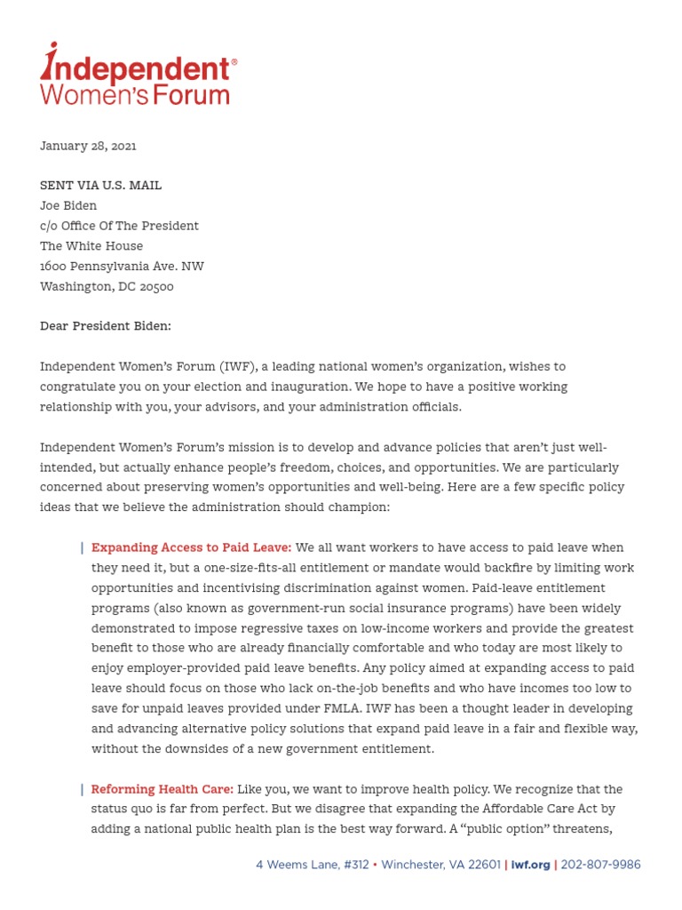 IWF mailed this letter to the Office of the President, to articulate more specifically which policies we believe are helpful and should be pursued.