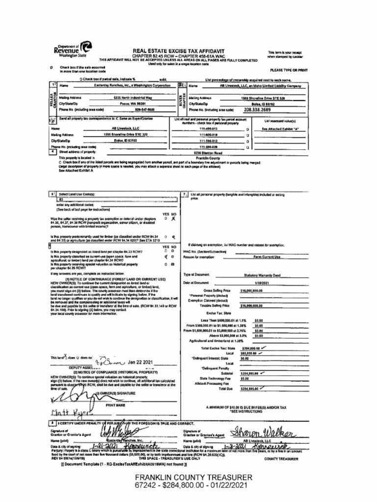 Tax document indicating the sale of a property in Franklin County from Easterday Ranches to AB Livestock LLC