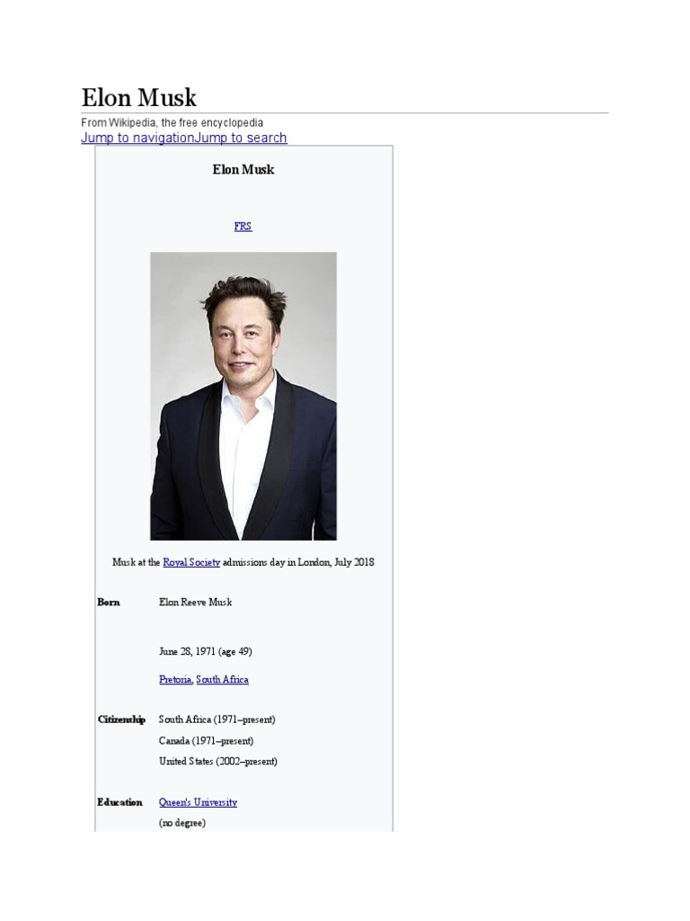 Elon Reeve Musk FRS (/ˈiːlɒn/ EE-lon; born June 28, 1971) is a business