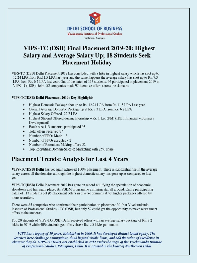 VIPS-TC (DSB) Delhi Placement 2019 has concluded with a hike in highest salary which has shot up to