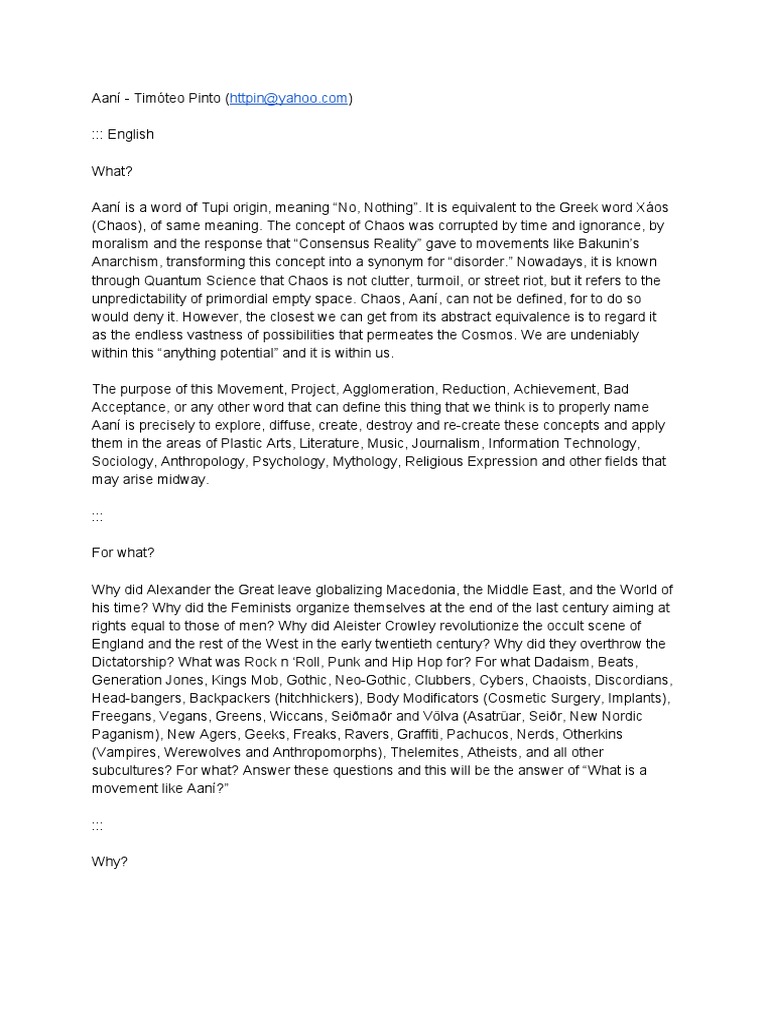 Aaní is a word of Tupi origin, meaning “No, Nothing”. It is equivalent to the Greek word Xáos