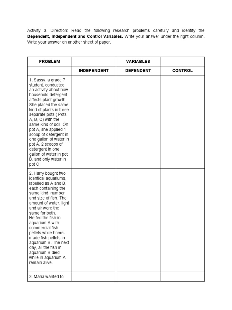 Dependent, Independent and Control Variables. Write your answer under the right column.