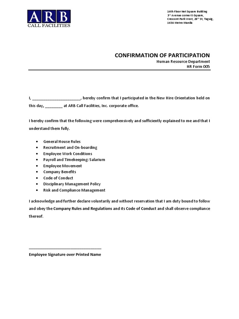 I, ______________________, hereby confirm that I participated in the New Hire Orientation held on