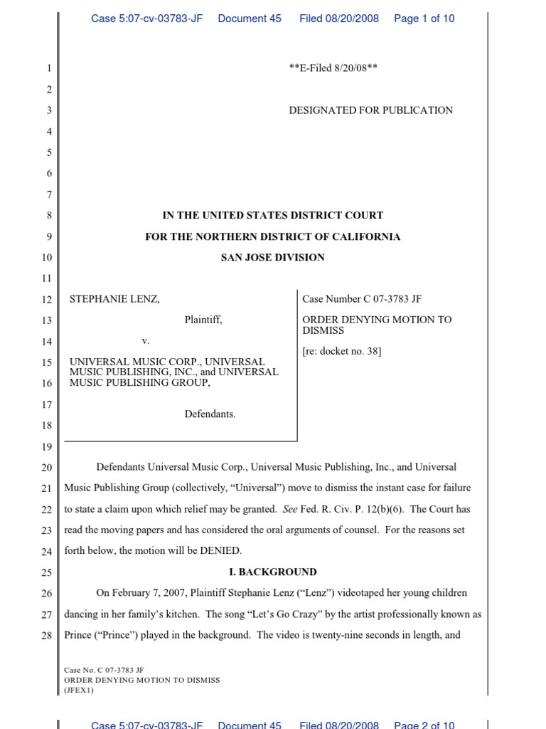 1 music copyrights.2 Lenz alleges that Universal issued the removal notice only to appease Prince
