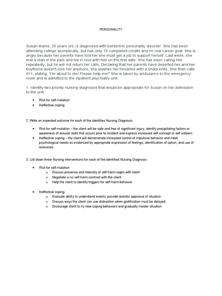 Susan Marks, 25 years old, is diagnosed with borderline personality disorder. She has been