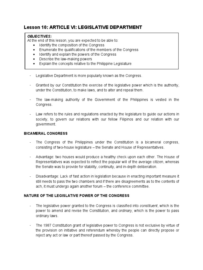 Lesson 10: ARTICLE VI: LEGISLATIVE DEPARTMENT