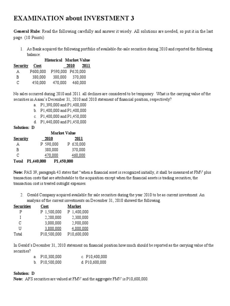 1. As Bank acquired the following portfolio of available-for-sale securities during 2010 and reported the following