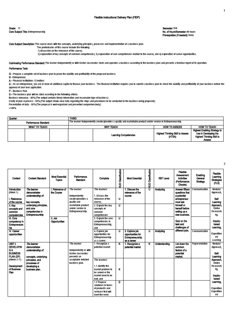 Culminating Performance Standard: The learner independently or with his/her classmates starts and operates a business according to the business plan and presents a terminal report of its operation.