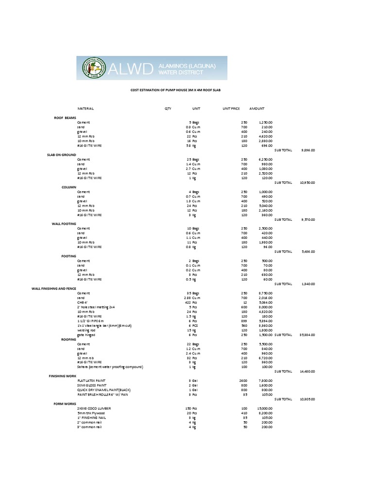 COST ESTIMATION OF PUMP HOUSE 3M X 4M ROOF SLAB