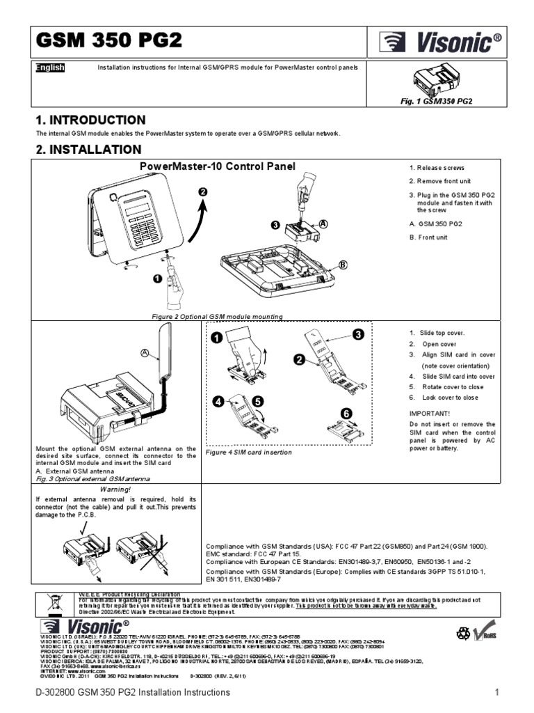 VISONIC LTD. 2011 GSM 350 PG2 Installation Instructions D-302800 (REV. 2, 6/11)