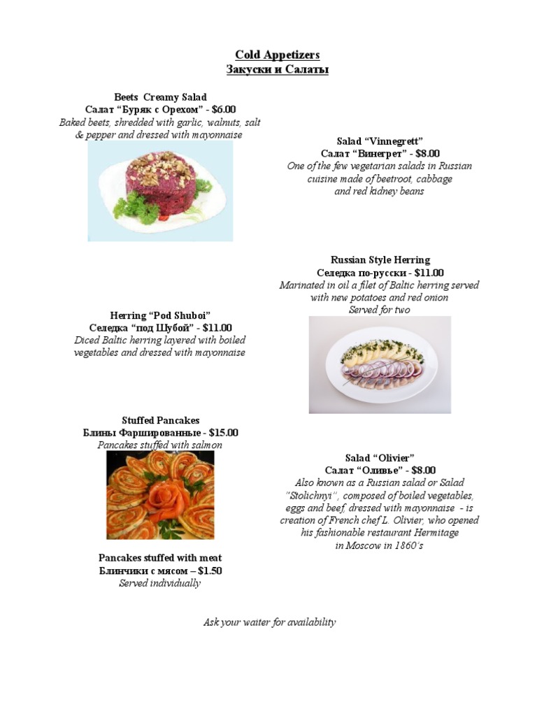 Котлета по-Киевски - $18.00 Мясо по-Строгановски - $14.00