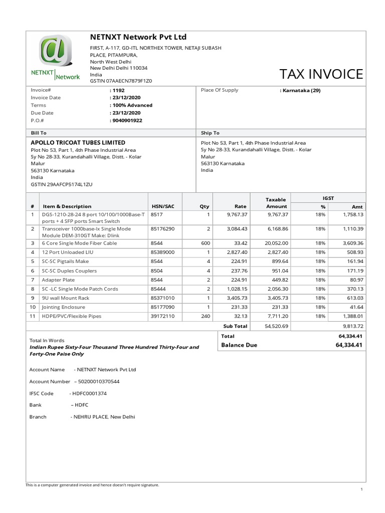 Invoice# : 1192 Place Of Supply : Karnataka (29)