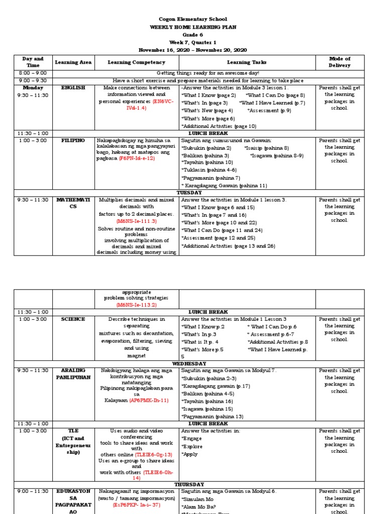 9:30 – 11:30 ARALING Nabibigyang halaga ang mga Sagutin ang mga Gawain sa Modyul 7. Parents shall get