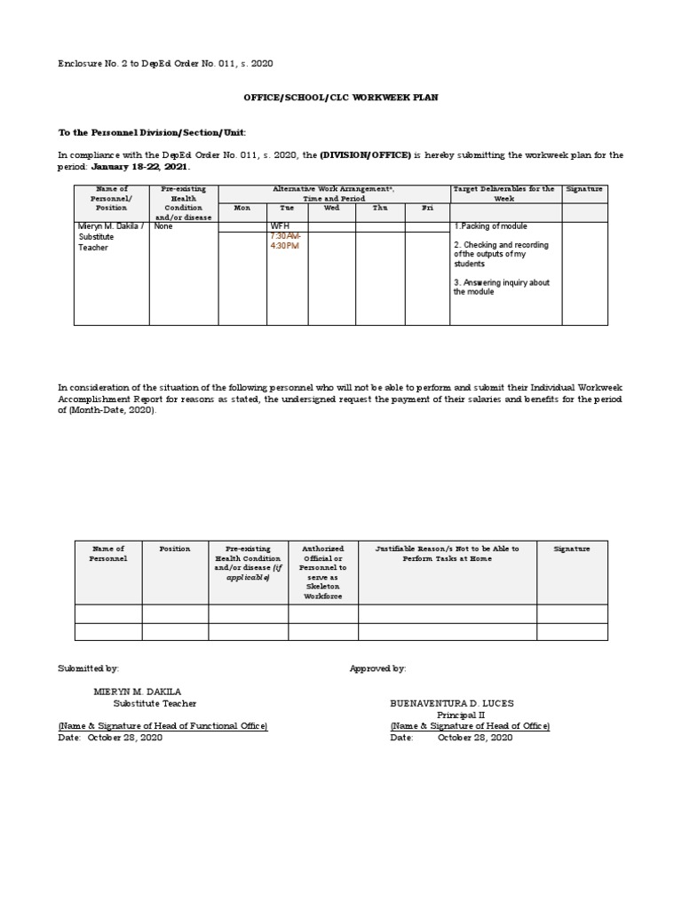 In compliance with the DepEd Order No. 011, s. 2020, the (DIVISION/OFFICE) is hereby submitting the workweek plan for the