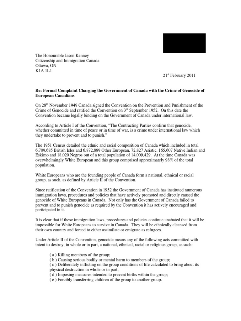 September 1952. On this date theConvention became legally binding on the Government of Canada under international law. According to Article I of the Convention, “The Contracting Parties confirm that genocide,whether committed in time of peace or in time of war, is a crime under international law whichthey undertake to prevent and to punish.” The 1951 Census detailed the ethnic and racial composition of Canada which included in total6,709,685 British Isles and 6,872,889 Other European, 72,827 Asiatic, 165,607 Native Indian andEskimo and 18,020 Negros out of a total population of 14,009,429. At the time Canada wasoverwhelmingly White European and this group comprised approximately 98% of the totalpopulation. White Europeans who are the founding people of Canada form a national, ethnical or racialgroup, as such, as defined by Article II of the Convention. Since ratification of the Convention in 1952 the Government of Canada has instituted numerousimmigration laws, procedures and policies that have actively promoted and directly caused thegenocide of White Europeans in Canada. Not only has the Government of Canada failed toprevent and to punish genocide as required by the Convention it has actively encouraged andparticipated in it. It is clear that if these immigration laws, procedures and policies continue unabated that it will beimpossible for White Europeans to survive in Canada. They will be ethnically cleansed fromtheir own country and forced to either assimilate or emigrate as refugees. Under Article II of the Convention, genocide means any of the following acts committed withintent to destroy, in whole or in part, a national, ethnical, racial or religious group, as such: ( a ) Killing members of the group;( b ) Causing serious bodily or mental harm to members of the group;( c ) Deliberately inflicting on the group conditions of life calculated to bring about itsphysical destruction in whole or in part;( d ) Imposing measures intended to prevent births within the group;( e ) Forcibly transferring children of the group to another group.