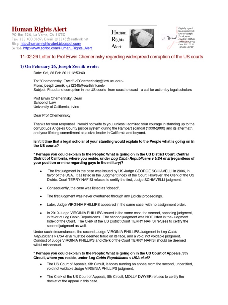 Date: Sat, 26 Feb 2011 12:53:40 To: "Chemerinsky, Erwin" <EChemerinsky@law.uci.edu> From: joseph zernik <jz12345@earthlink.net> Subject: Fraud and corruption in the US courts from coast to coast - a call for action by legal scholars Prof Erwin Chemerinsky, Dean School of Law University of California, Irvine Dear Prof Chemerinsky: Thanks for your response! I would not write to you, unless I admired your courage in standing up to the corrupt Los Angeles County justice system during the Rampart scandal (1998-2000) and its aftermath, and your lifelong commitment as a civic leader in California and beyond.
