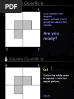 The document presents a series of 4 square questions that ask the reader to visually divide the white areas of 4 labeled squares (A, B, C, D) into an increasing number of equal pieces. For each question, the document provides feedback and encouragement to the reader to solve the problem, then reveals the answer. The final question challenges the reader to divide square D into 7 equal pieces in under 7 seconds. The document concludes by stating its purpose was to observe how the mind can be conditioned.