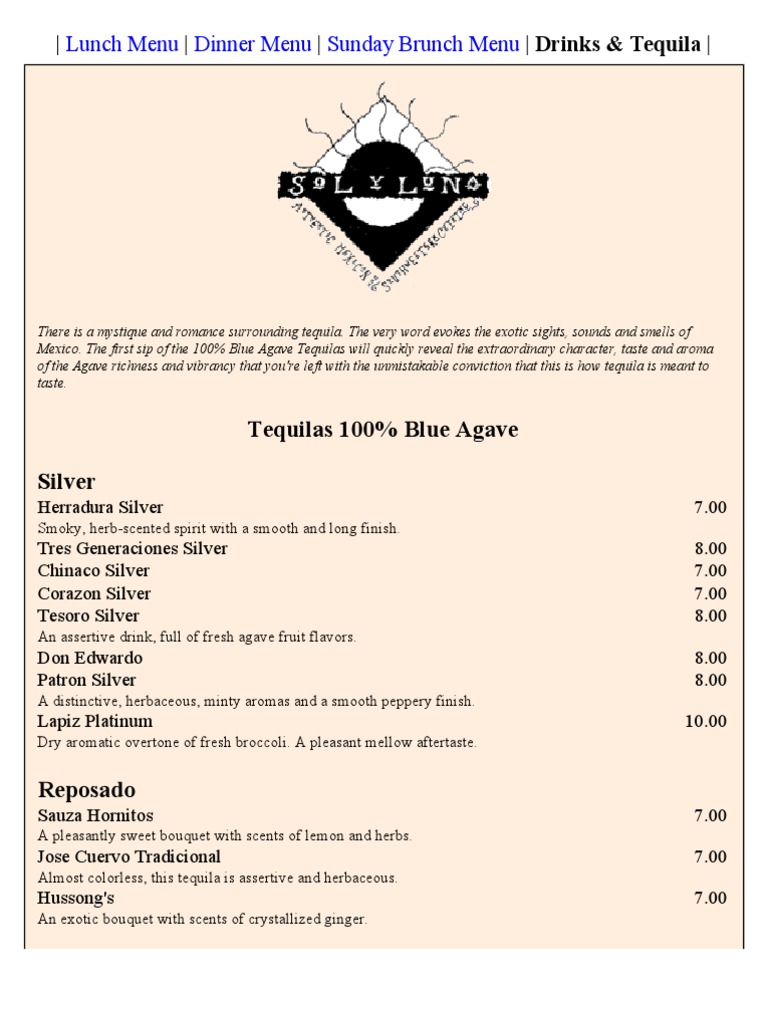 | Lunch Menu | Dinner Menu | Sunday Brunch Menu | Drinks & Tequila |
