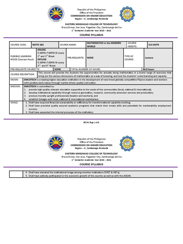 Course Syllabus of MATH 101 - Mathematics in the Modern World, First Semester of SY 2020-2021.
