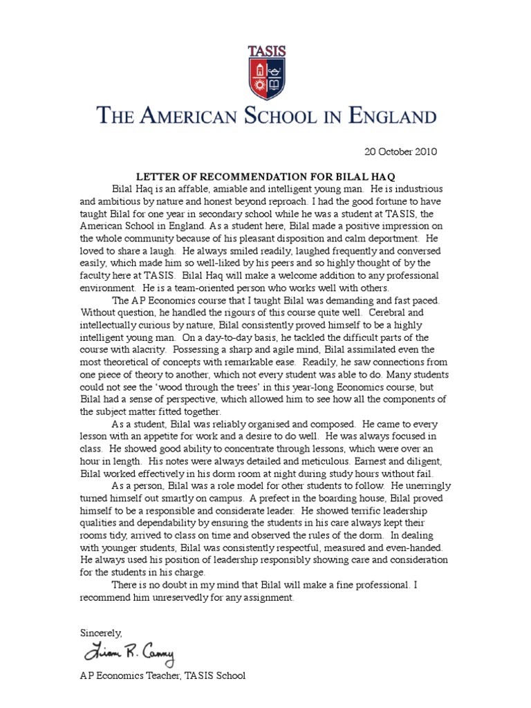 LETTER OF RECOMMENDATION FOR BILAL HAQ