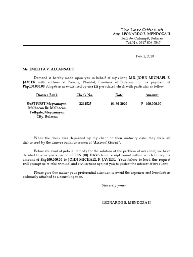 amount of Php100,000.00 to JOHN MICHAEL F. JAVIER. Your failure to heed this request
