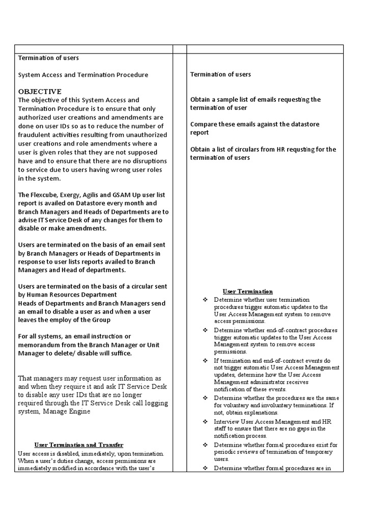 System Access and Termination Procedure Termination of users