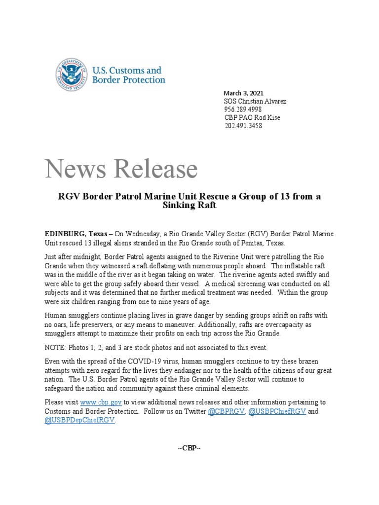 – On Wednesday, a Rio Grande Valley Sector (RGV) Border Patrol MarineUnit rescued 13 illegal aliens stranded in the Rio Grande south of Penitas, Texas. Just after midnight, Border Patrol agents assigned to the Riverine Unit were patrolling the Rio Grande when they witnessed a raft deflating with numerous people aboard. The inflatable raft was in the middle of the river as it began taking on water. The riverine agents acted swiftly and were able to get the group safely aboard their vessel. A medical screening was conducted on all subjects and it was determined that no further medical treatment was needed. Within the group were six children ranging from one to nine years of age. Human smugglers continue placing lives in grave danger by sending groups adrift on rafts with no oars, life preservers, or any means to maneuver. Additionally, rafts are overcapacity as smugglers attempt to maximize their profits on each trip across the Rio Grande. NOTE: Photos 1, 2, and 3 are stock photos and not associated to this event. Even with the spread of the COVID-19 virus, human smugglers continue to try these brazen attempts with zero regard for the lives they endanger nor to the health of the citizens of our great nation. The U.S. Border Patrol agents of the Rio Grande Valley Sector will continue to safeguard the nation and community against these criminal elements.Please visit www.cbp.gov to view additional news releases and other information pertaining to Customs and Border Protection. Follow us on Twitter @CBPRGV, @USBPChiefRGV and