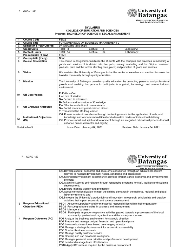 2 Course Title FUNDAMENTALS OF BUSINESS MANAGEMENT 2