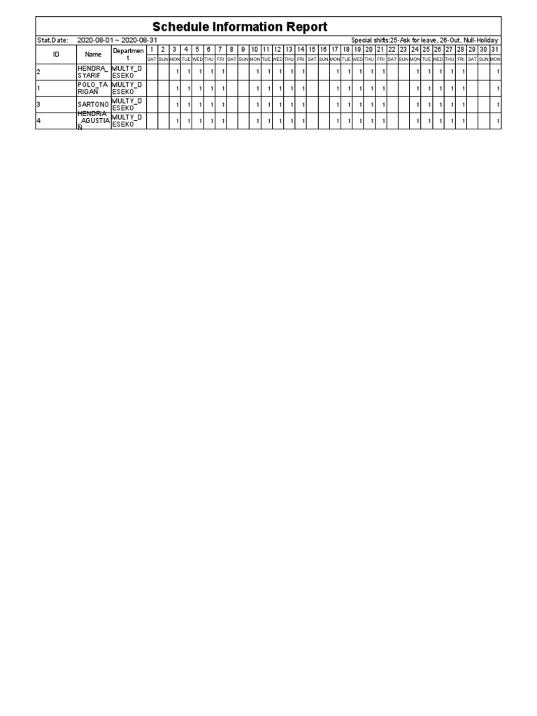 Stat.Date: 2020-08-01 ~ 2020-08-31 Special shifts:25-Ask for leave, 26-Out, Null-Holiday