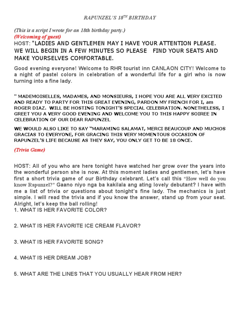 (Option 2 ra ni) HOST: Happy birthday song. "Happy Birthday Rapunzel! Let