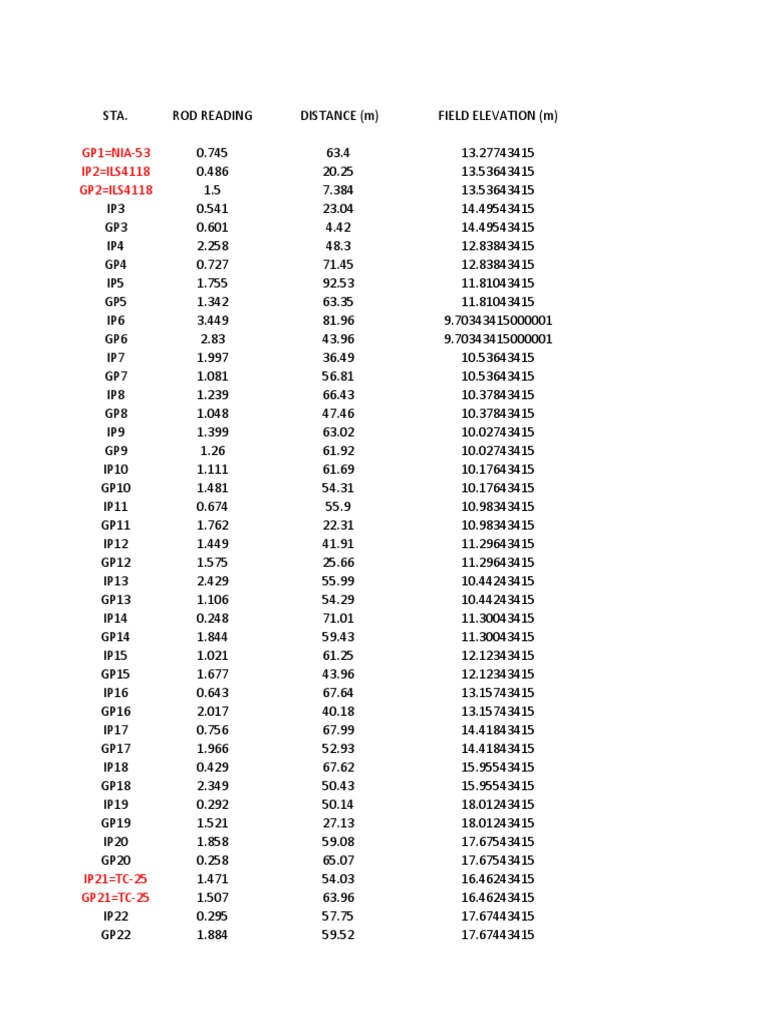 ROD READING DISTANCE (m) FIELD ELEVATION (m)