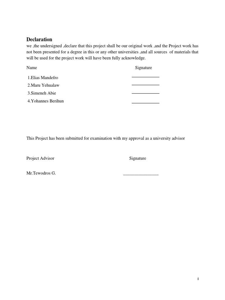 the project. We would like to give our recognition to our project adviser Mr.Tewodros Gera who