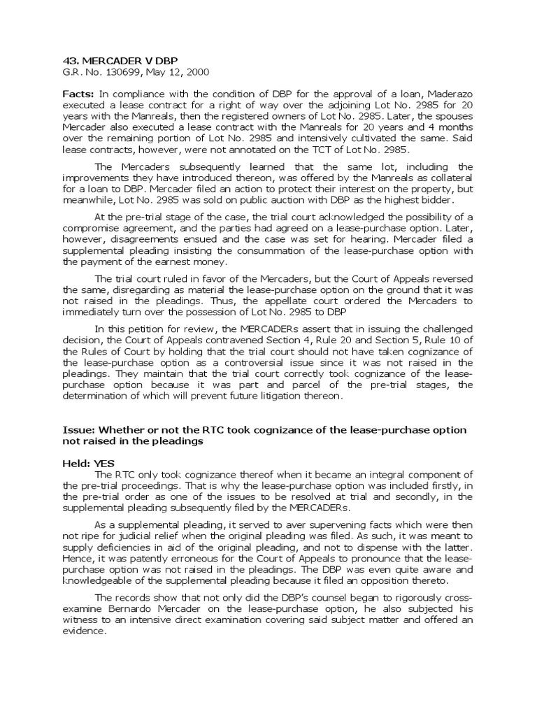 purchase option was not raised in the pleadings. The DBP was even quite aware and